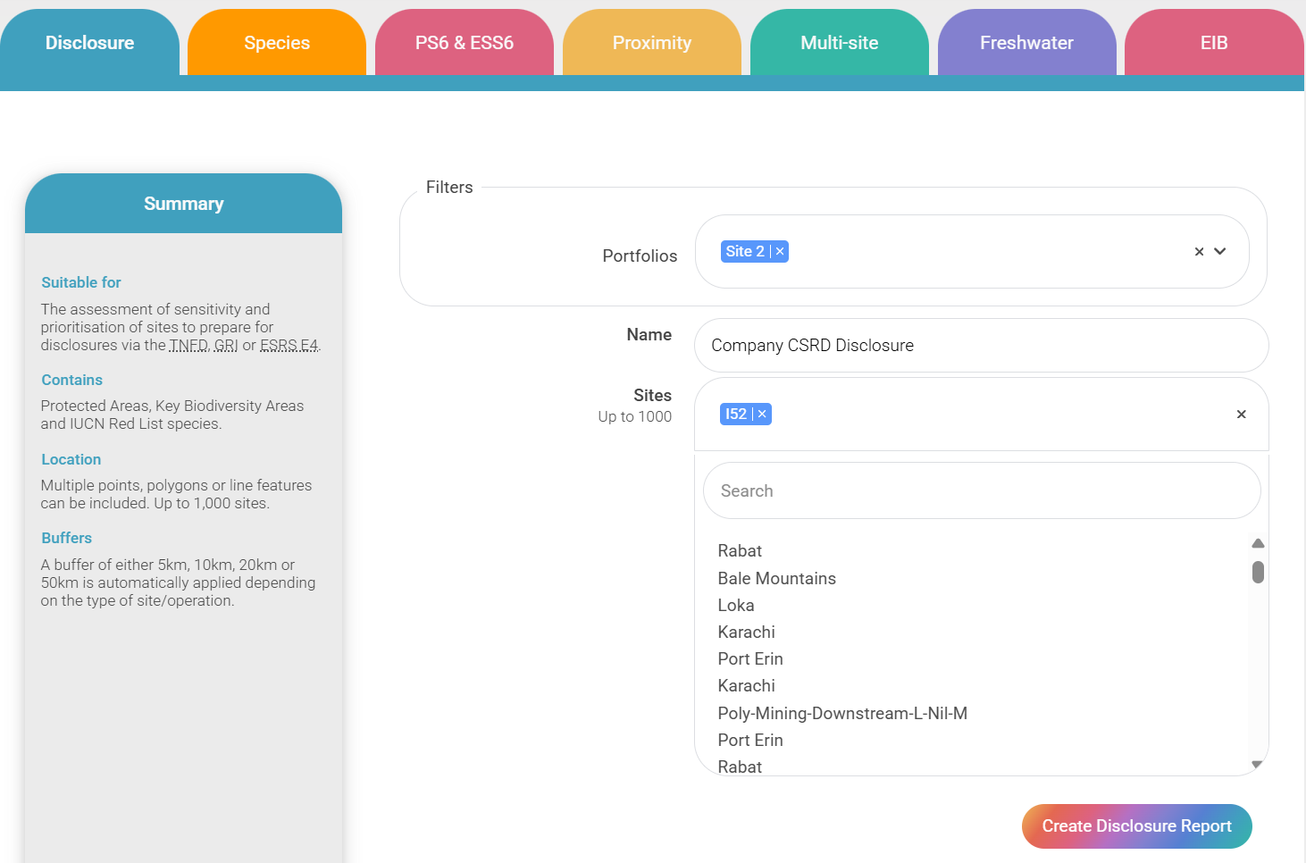 Ensure alignment with biodiversity strategies and support Nature Positive commitments with clear, actionable insights. Download tailored reports for biodiversity risk assessments (PS6, ESS6) or disclosure requirements such as GRI (Global Reporting Initiative), TNFD (Taskforce on Nature-related Financial Disclosures) and CSRD (Corporate Sustainability Reporting Directive)